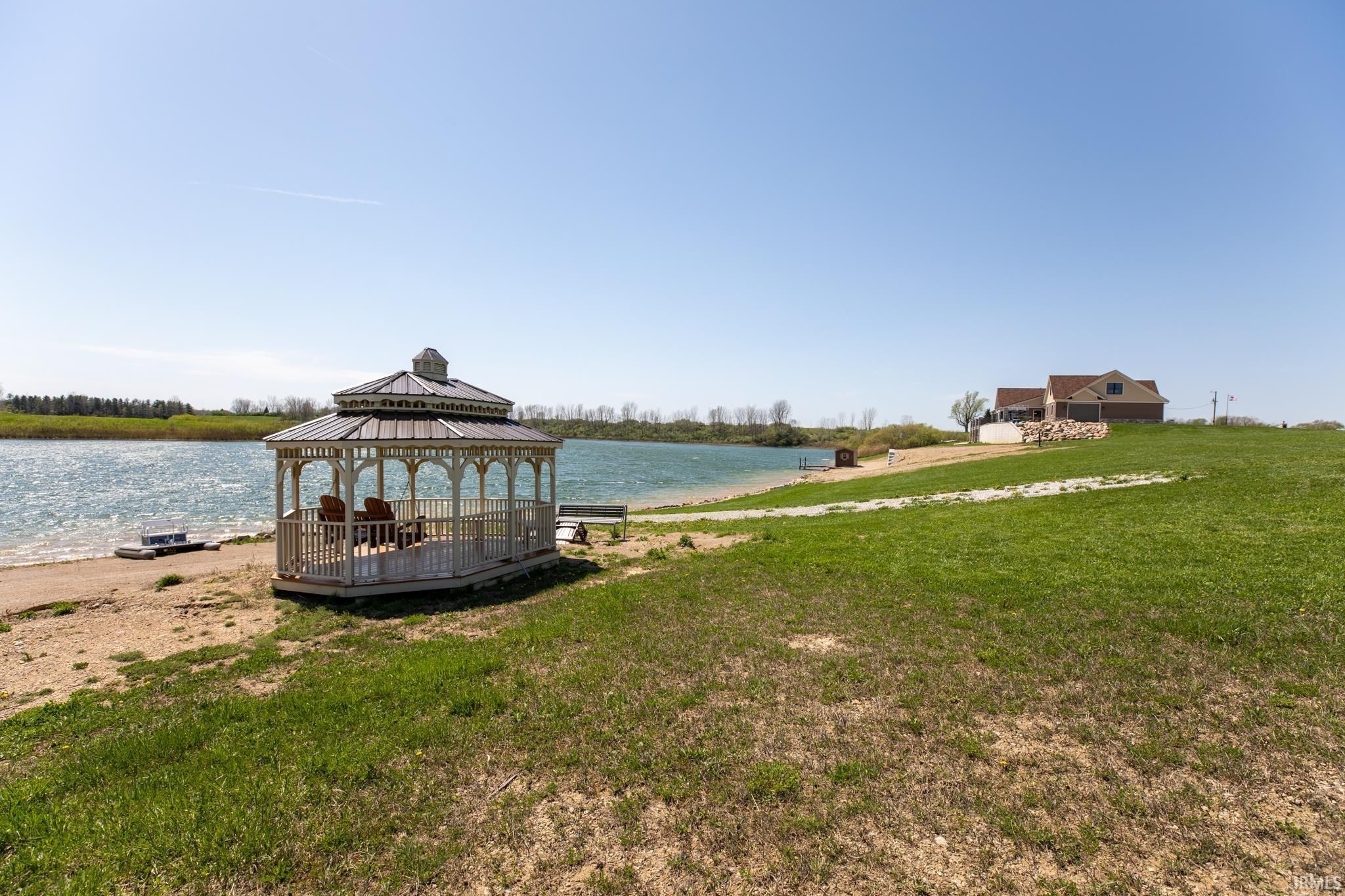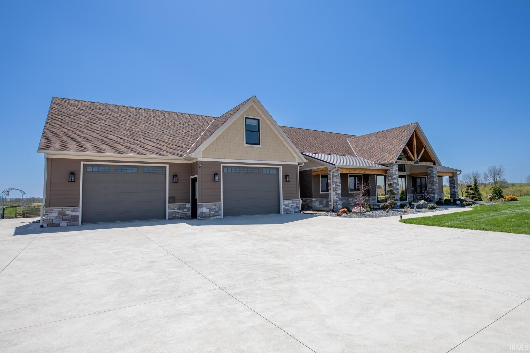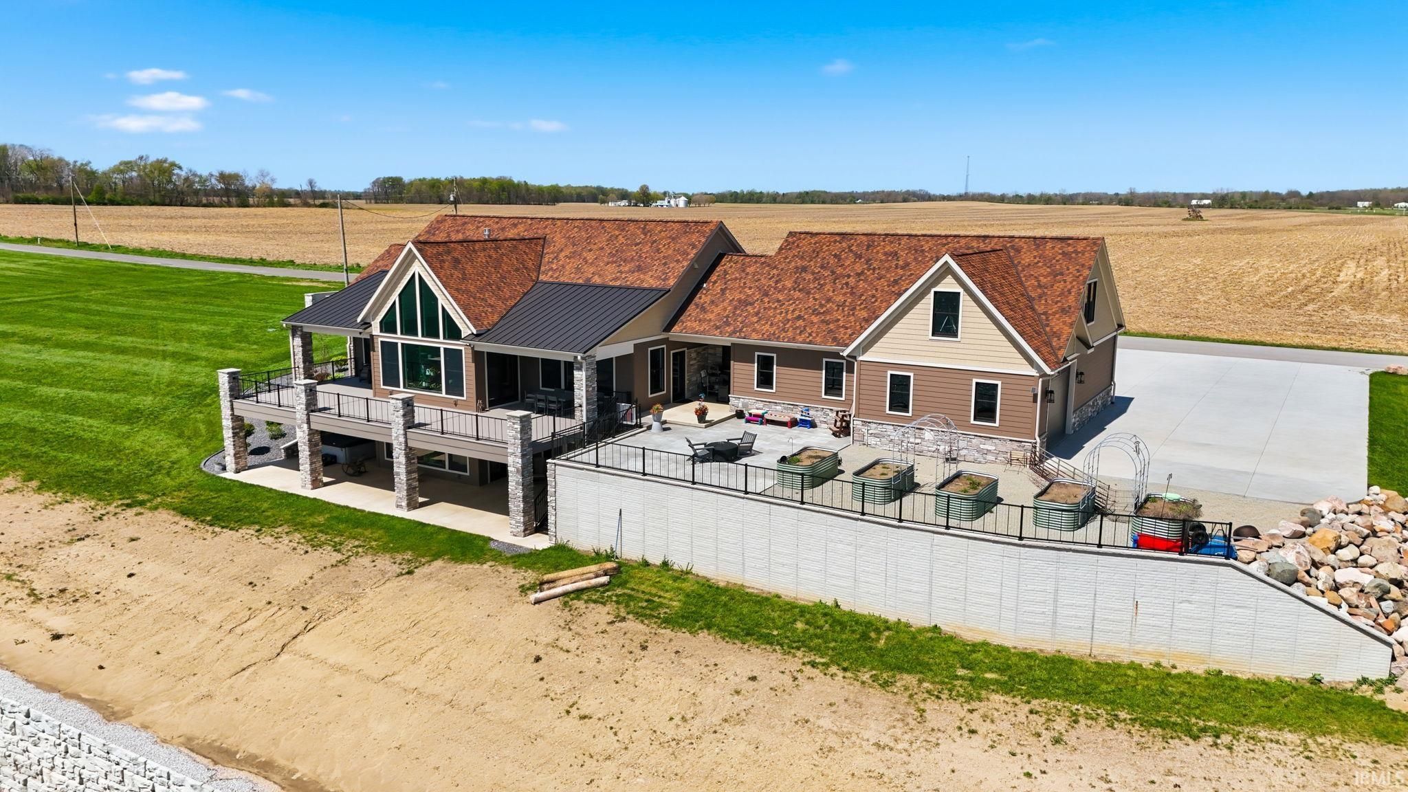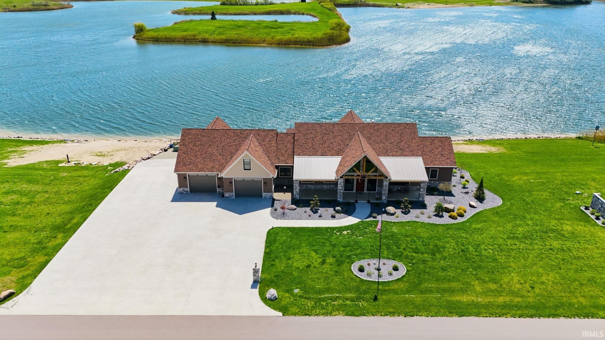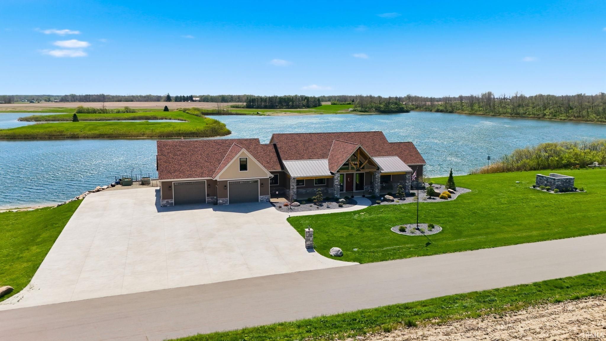 Award-winning luxury meets breathtaking waterfront views in this stunning 4-bedroom, 4.5-bath home, known as “The Golden Pond” by Renewal Homes. Recognized as the 2023 Builder’s Association of North Central Indiana Homes on Parade People’s Choice Award winner, this custom-built property showcases exceptional craftsmanship and thoughtful design throughout. Set along a private, stocked lake and 43 acres, this property offers a rare opportunity for peaceful waterfront living. Enjoy the private pier, gazebo, and charming shed, all designed for relaxation and entertaining. Expansive outdoor spaces include a massive deck overlooking the water and beautifully maintained garden areas. Inside, the open-concept layout features a chef’s kitchen with stone surfaces, bar seating, walk-in pantry, and seamless flow into the dining and living room with a cozy fireplace. The luxurious primary suite includes a spa-like bath with a soaking tub, stone shower, and an impressive walk-in closet. Three-car attached garage has epoxy floors and leads the way to a finished loft with a bedroom, bathroom, and built-in office area. The walk-out basement offers a large rec room with polished concrete floors, space for a future kitchenette, craft room, second laundry area, and access to a private hot tub retreat. Driveway and sidewalks are prepped for heating installation. Home is wired for a whole house generator.